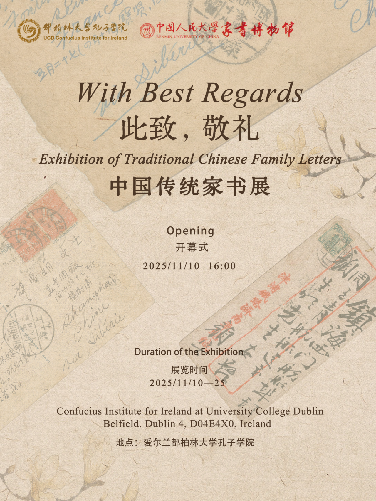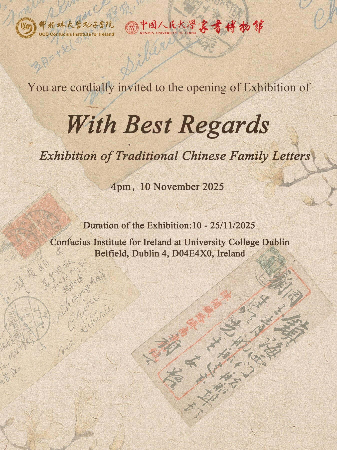 ‘With Best Regards: Exhibition of Traditional Chinese Family Letters’, jointly organised by Family Letters Museum of Renmin University of China and UCD Confucius Institute for Ireland, is set to open.